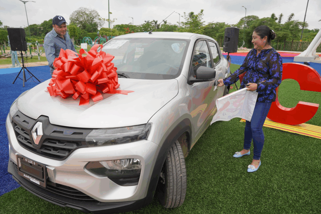 El presidente municipal, Ponciano Vázquez Parissi hizo entrega de un automóvil, a la profesora Carolina Ruiz Martínez, directora de la primaria Sebastián Lerdo de Tejada, afortunada ganadora de la rifa organizada entre los docentes, como parte de la celebración del Día del Maestro.