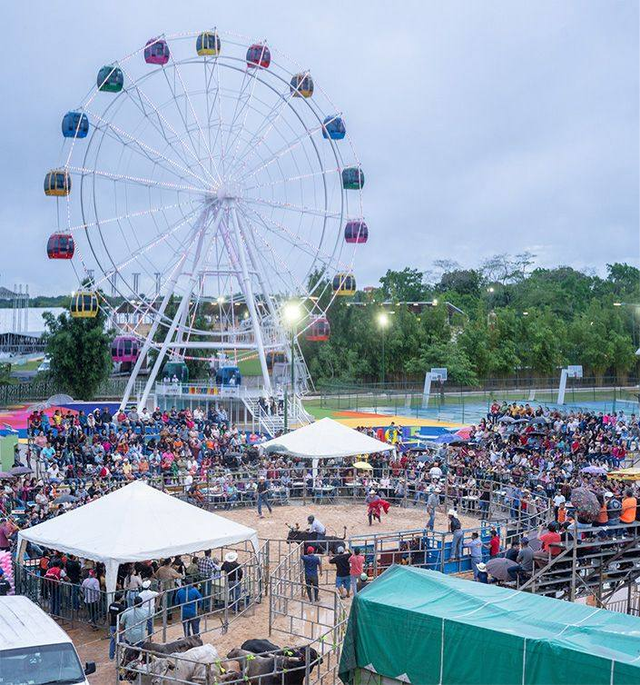 La lluvia no fue impedimento para que valientes jinetes demostrarán su destreza montando toros de alto nivel en el ruedo, en una tarde llena de adrenalina y pasión, amenizada por banda La Encantadora, frente a la majestuosa rueda de la fortuna.