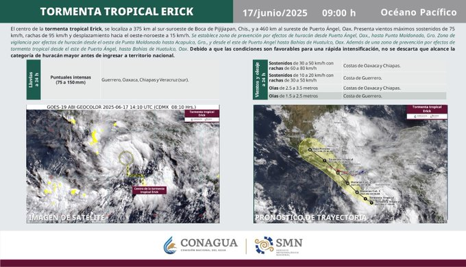 En su último aviso, el SMN indicó que el centro de la tormenta tropical “Erick” se localiza a 375 kilómetros al sur-suroeste de Boca de Pijijiapan, en Chiapas. 3, 4 o 5 antes de tocar tierra en Oaxaca.