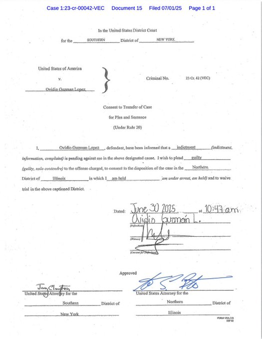 El periodista Keegan Hamilton dio a conocer el documento denominado “Consentimiento a la transferencia del caso para la declaración de culpabilidad y la sentencia”, que fue firmado por Guzmán López el 30 de junio y en donde se dio por enterado que sobre él pese una acusación pendiente en su contra.