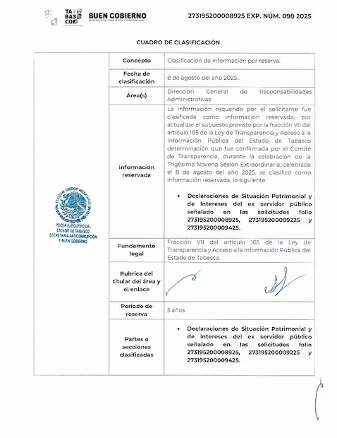 Reservan 5 años declaración; Secretaría Anticorrupción de Tabasco afirma que divulgar datos entorpece investigación; “puede haber mal manejo de datos y arriesgar seguridad pública”.